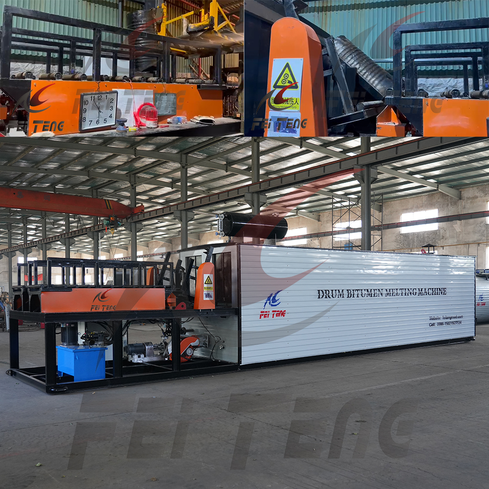 一、本设备采用自动弹簧门密闭集装箱结构,上桶方式为叉车或其它机械提起沥青桶放在入口处导轨上,即可推进,操作简单省力。